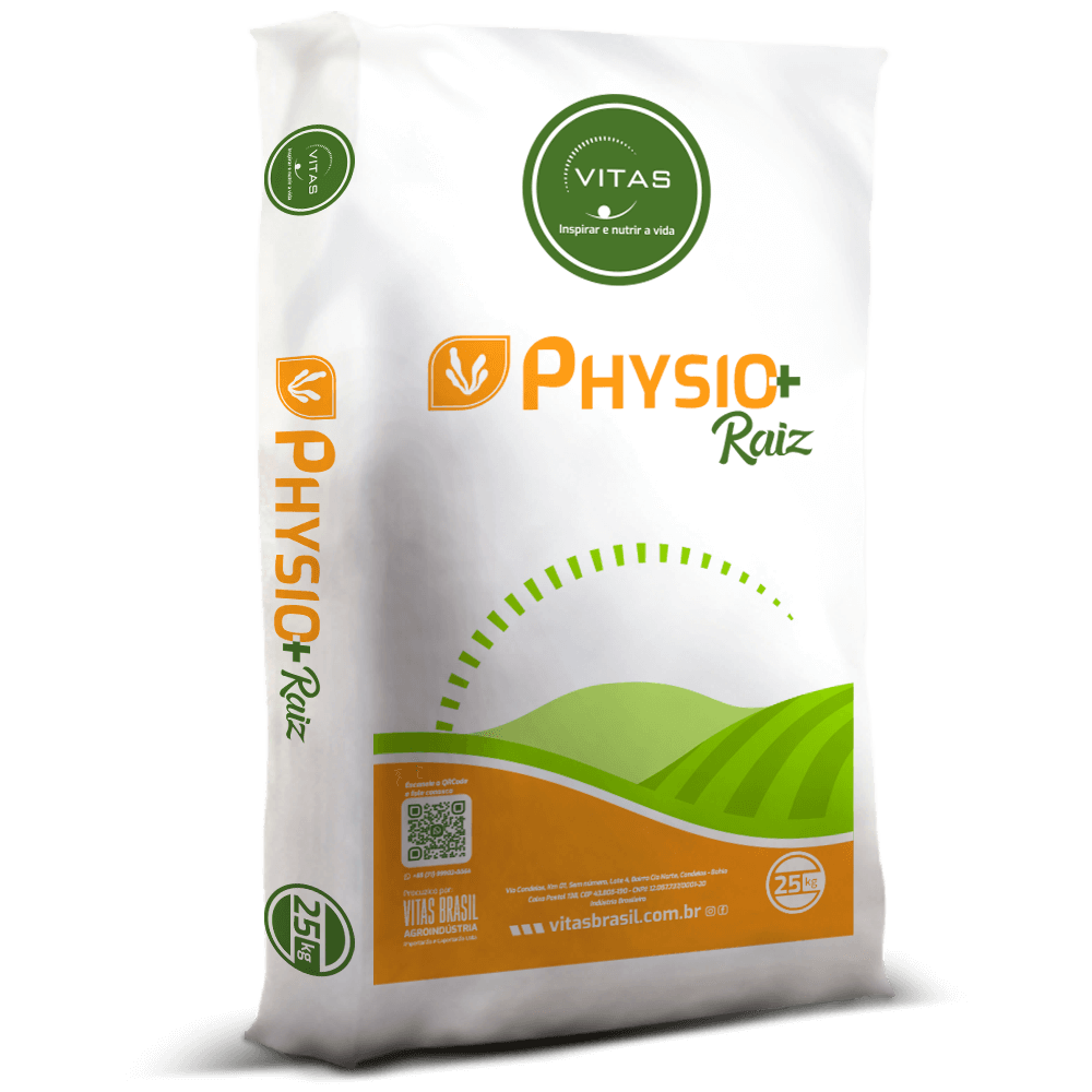 Enriquecido com a tecnologia PHYSACTIV, o Physio + Raiz proporciona um adequado estímulo ao enraizamento, uma maior absorção de Cálcio (Ca) e Fósforo (P), os quais são essenciais para a fase de estabelecimento e desenvolvimento da cultura, garante um melhor suporte a estresse térmico, hídrico e nutricional, e tem um papel fundamental na correção de pH em solos ácidos. O Physio + Raiz é um fertilizante NPK no grão e livre de Cloro (Cl) e Ureia, indicado para uso na base de plantio ou cobertura.